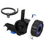 こちらがフォローフォーカス。レンズのピントリングに合う大きさのギアをはめて、歯車式にフォーカシングします。 |